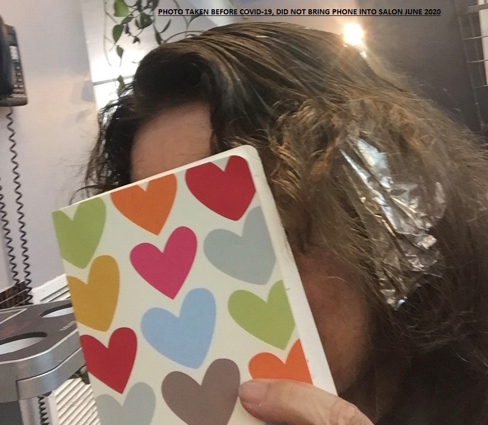 Nobody wants to be noticed when they are getting their hair colored. It’s not a good look. Your hair is lathered with gobs of dye. Some of us are hosting aluminum foil from random spots on our head. Hair is pulled back and plastered to your crown. And then there is me wearing what looks like a shower cap over the gobs of color. Add a mask to this assembly and you have an extraordinary looking group. No photos, PLEASE!